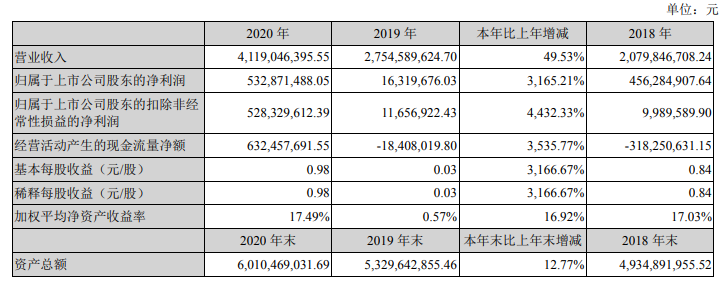 同时,公司发布年度报告,公司2020年度实现净利润5.33亿元,同比增长3165.21%。向全体股东每10股派发现金红利2元(含税),送红股7股(含税),不以公积金转增股本。