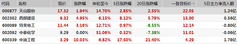 其中,天山股份获一直标价22.05元,距今日收盘价17.32元还有27.3%的涨幅空间;西部特工获目标价15元,特变电工、中泰化学、中油工程等目标价均获公布。