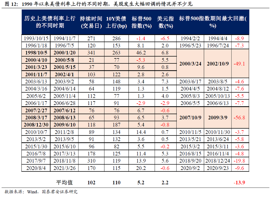 回顾1990年以来美债利率上行的不同时期,单独靠美债利率上行本身并不一定导致美股崩盘,但是美股发生大幅回调的情况并不少见。1998年10月至2000年1月,10Y美债累计上行263bp,而互联网泡沫则在2000年3月破灭,标普500指数最多下跌49.1%;2017年9月至2018年11月,10Y美债累计上行119bp,尽管标普500指数累计上涨13.9%,但是发生过三次大幅下跌,分别是1-2月的-10.2%、3-4月的-7.3%、9-12月的-19.8%,尤其四季度暴跌引发美联储加息周期提前结束并转向宽松。