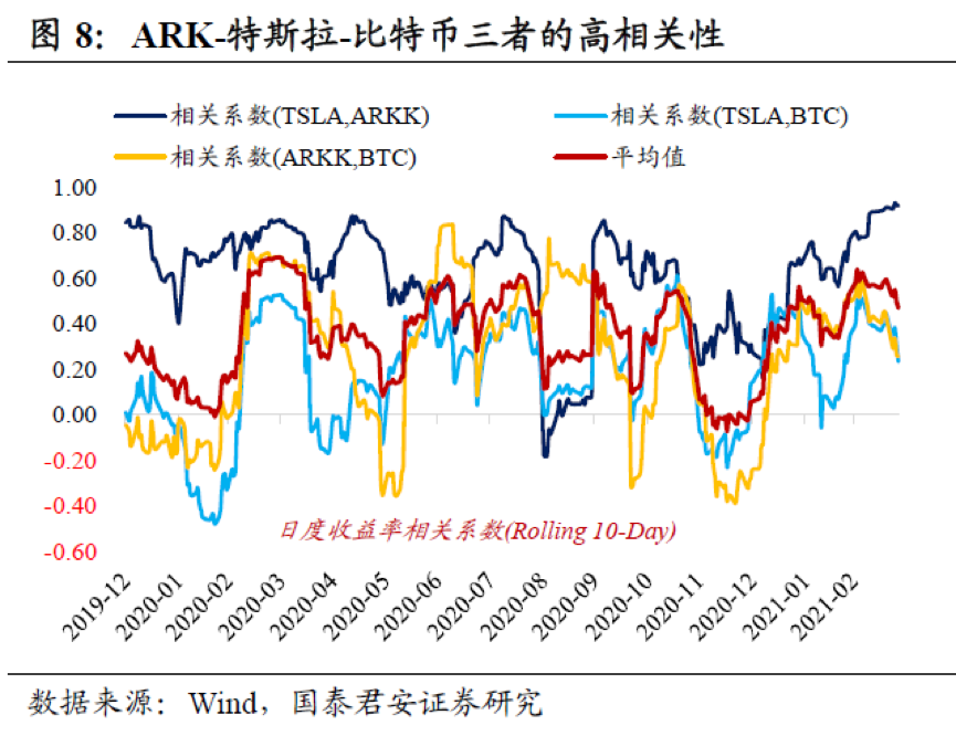 另一个更直接的例证:ARK-特斯拉-比特币三者的高相关性,隐藏着很强的负反馈风险。ARK基金重仓科技股、特斯拉并看好比特币、特斯拉购买比特币并可能接受客户使用比特币支付、ARK基金产品以ETF为主,从而形成一种诡异的“闭环”。一旦比特币下跌、特斯拉/科技股遭抛售、ETF大量赎回,三者负反馈机制将放大下跌风险,这在2月下旬到3月初的下跌已初见端倪。