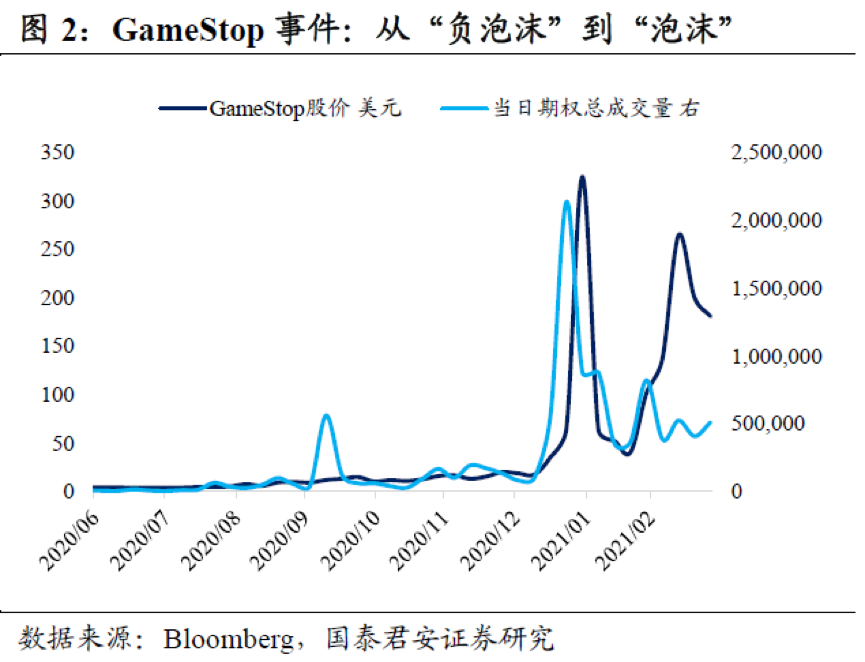 回顾GameStop事件:从“负泡沫”到“泡沫”的完美演绎。事件开端是基本面孱弱的GameStop卖空比例一度高达140%(理论上不该存在),空头过于拥挤埋下隐患,导火索是香橼看空报告引发散户质疑,在社交媒体推波助澜下,叠加低利率环境和财政补贴,散户加杠杆买入股票和看涨期权进行“逼空”,做空机构不得不买入股票来回补空头仓位、做市商不得不买入股票对冲卖出看涨期权的风险,因此股价在“自我强化”中走向极端。作为最大空头的对冲基金被迫强行平仓并险些破产,线上交易平台Robinhood对GameStop施加买入限制,香橼宣布停止做空研究,一场多杀空的行情见顶,接着就切换到多杀多,股价随后“自由落体”,直到近期似又“死灰复燃”,但期权成交量远不及当初。