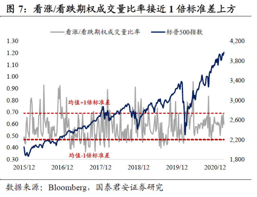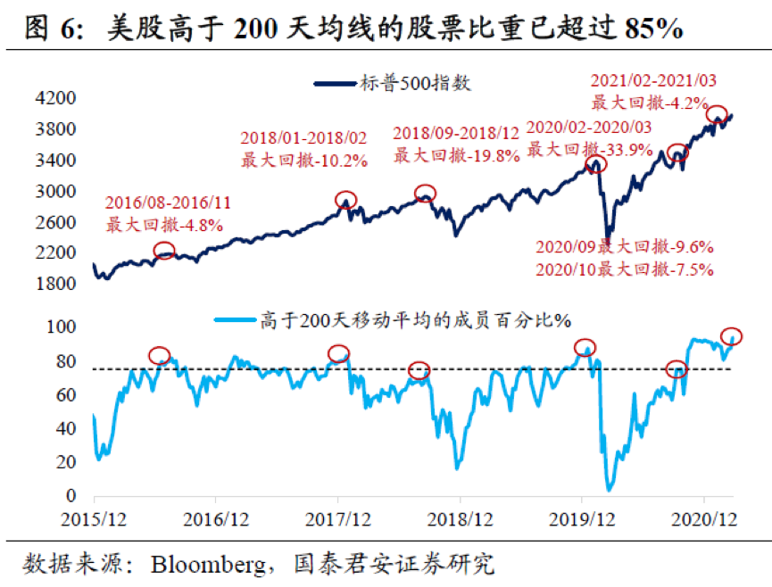 如果简单以技术指标来分析,衡量投资者相对乐观情绪的标普500指数看涨/看跌期权成交量之比,已经接近2015年以来均值的1倍标准差上方,而衡量上涨广度的标普500指数中价格高于200天均线的股票比例,已经超过85%,而2015年以来当这一指标超过75%,美股往往会出现回调,剔除2020年3月“股灾”后的平均回撤幅度在9.1%左右。