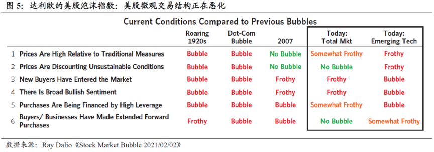 桥水基金创始人雷·达利欧(Ray Dalio)通过六个量化指标来观测从1910年以来美股的泡沫程度,目前约位于77%历史分位数,1929年大崩盘前和2000年互联网泡沫破裂前则对应100%的水平。