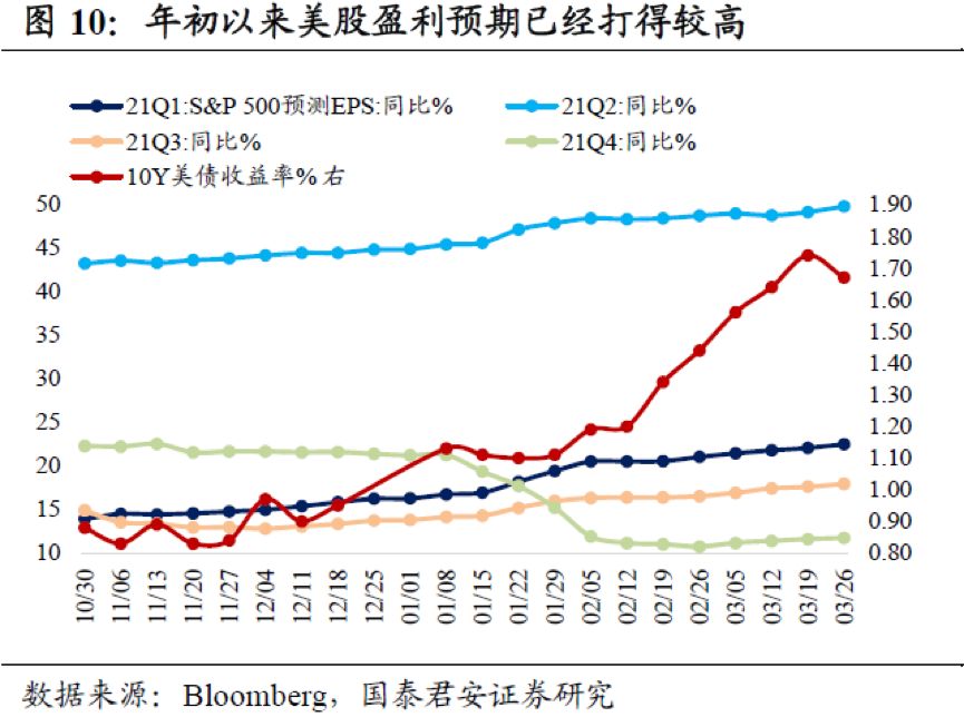随着美债利率上行仍有空间,美股盈利预期的正面影响将逐步衰弱,利率预期的负面影响将逐步增强,考虑到年初以来盈利预期已经打得较高、下半年美联储将进一步释放收紧信号,美股尤其科技股下跌风险正在加大。年初以来10Y美债上行近80bp,但对美股估值的拖累被盈利预期的上修(拜登财政刺激)所抵消,因此美股尚停在价值/成长风格切换阶段。根据彭博统计,标普500指数2021Q1/Q2/Q3/Q4 EPS同比增速一致预期分别为22.5%、49.8%、17.9%和11.7%,除Q4较年初下调以外,Q1/Q2/Q3分别上修6.2、4.9、4.1个百分点;2021年全年EPS增速一致预期为24.8%,较年初上修2.5个百分点。