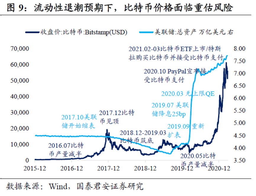 随着美联储正式将削减QE摆上桌面进行讨论,流动性退潮预期下,比特币价格面临重估风险。由于看好虚拟货币和区块链技术的前景,比特币作为另类资产的价值越来越被海外机构所认可,考虑到比特币产量每四年缩减一半(目前已完成三次减半),部分观点甚至将其看成“数字黄金”。但2020年以来的比特币大牛市,除了产量减半、机构接受度迅速提升、散户大量涌入等因素,本质上仍是全球流动性泛滥所推动的,这可以从比特币价格走势和美联储总资产规模的正相关性看出。上轮牛市的顶部(2017年12月)就发生在美联储开始缩表后(2017年10月),见顶前最后一波上涨来自11月美国感恩节期间新入场的散户。
