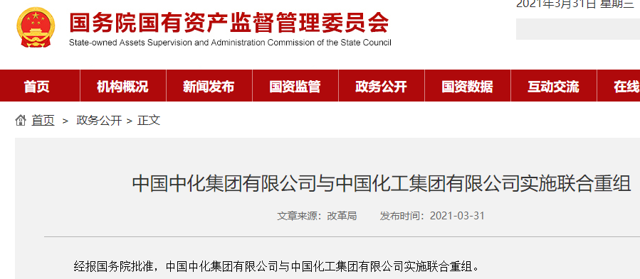 经报国务院批准,中国中化集团有限公司与中国化工集团有限公司实施联合重组。