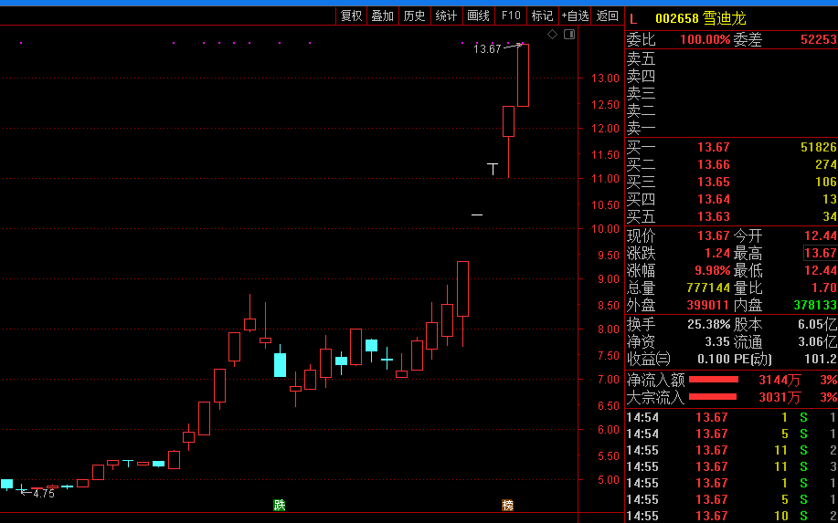 盘面上,雪迪龙今日放量涨停收报于13.67元,为连续第五个交易日涨停,股价创出近4年新高,年内涨幅已高达122.64%。