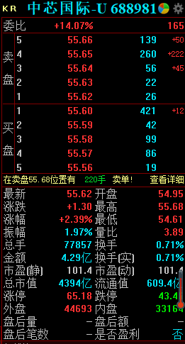 4月1日,中芯国际-U持续拉升,截至发稿,涨逾2%,报55.62元,市值4394亿元。