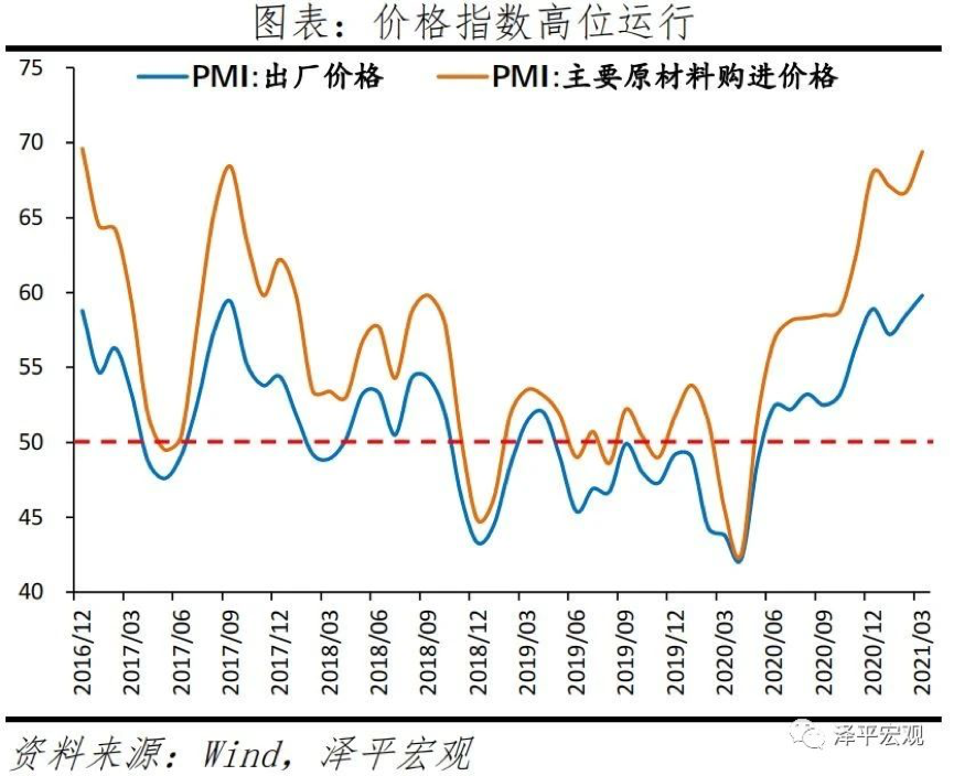 3月制造业PMI主要原材料购进价格指数和出厂价格指数分别为69.4%和59.8%,较上月上升2.7和1.3个百分点。大宗商品价格持续攀升;3月布伦特原油均价环比5.6%,南华工业品指数环比2.8%,南华螺纹钢环比7.6%,LME铜环比6.6%。