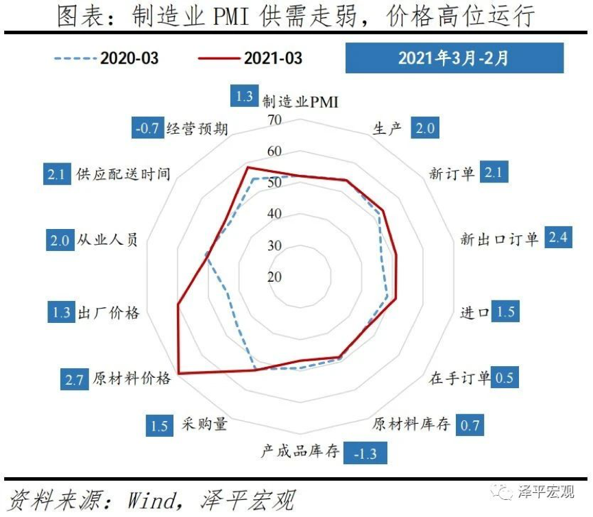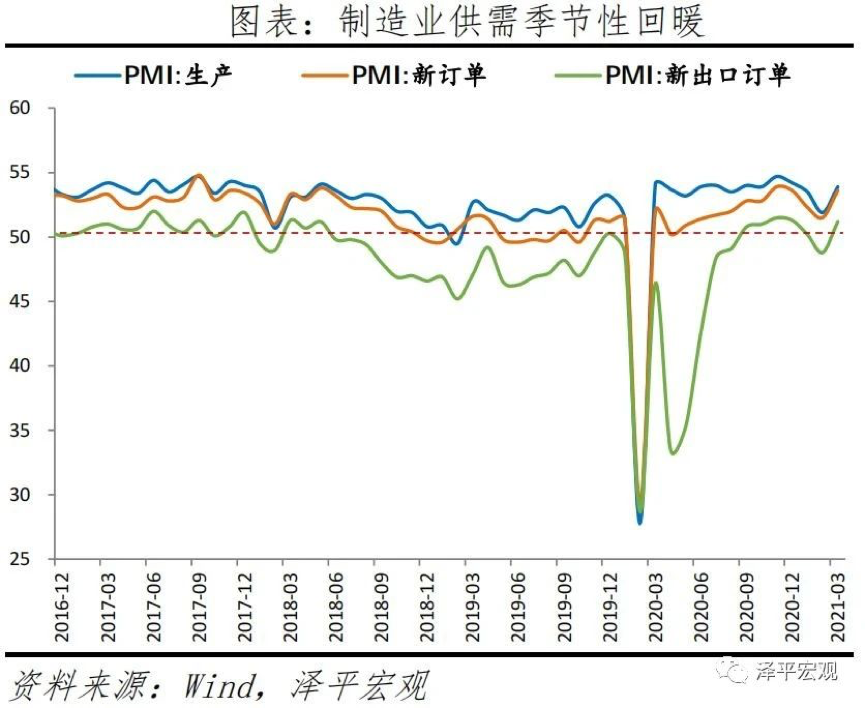1、3月季节性反弹,拉长看经济进入顶部区间。3月生产、新订单、新出口订单、建筑业、服务业活动等多项反映经济运行指标在连续两个月下滑后,出现回升迹象;但存在季节性因素。综合1-3月平均值来看,景气度不及2020年底。