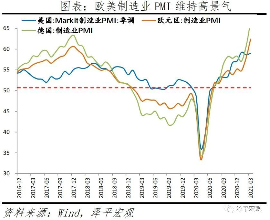 近期通胀预期进一步增强:3月制造业PMI主要原材料购进价格指数和出厂价格指数分别为69.4%和59.8%,较上月上升2.7和1.3个百分点,主要原因是随着疫情逐步缓解全球经济复苏共振、拜登拟推出3万亿美元基建刺激计划、美元超发流动性泛滥等。