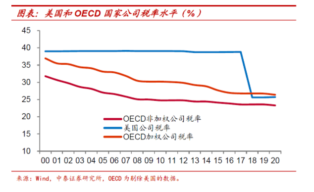 资金筹集来自加税,税率重回最高水平。基于对拜登计划的不同理解,市场对于基建资金的来源尚有一定争议。但大体上来看,这次拜登的基建计划所需资金,主要还是通过加税的方式进行筹集,其中最关键的提议就是拟将美国公司税税率提高到28%。而在特朗普减税之后,美国法定公司税率(联邦和州合并计算)已从OECD(经合组织)国家最高水平降至和OECD国家平均水平相差不远,根据税收基金会的测算,拜登加税举措将使得美国对公司收入的综合税率再度回到OECD国家最高水平。