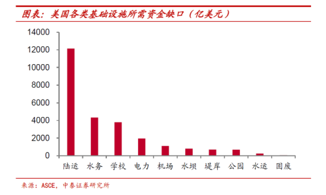 资金缺口约2.6万亿美元,交运占比超过一半。而据美国土木工程师协会的估计,在未来的十年内,美国如果想要保持基础设施的良好状况,所需的资金缺口大约在2.59万亿美元,其中以交通运输的资金缺口占比最高,陆运、水运和航运合计占比要超过一半。
