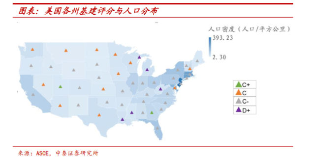 人口集聚地区,基建设施更差。而美国土木工程师协会对美国当前基建状况的评级也只有C-,虽然较上一次评级有所提高,但同样指向美国老化的基建设施状况。特别值得注意的是,美国基建设施同其人口分布情况也并不匹配,人口密度较高的美国东西海岸大部分州基建设施评分也只有C-,并没有高出美国的平均水平,而人口密度较低的中部地区,部分州基建评分反倒要好于东西部地区。
