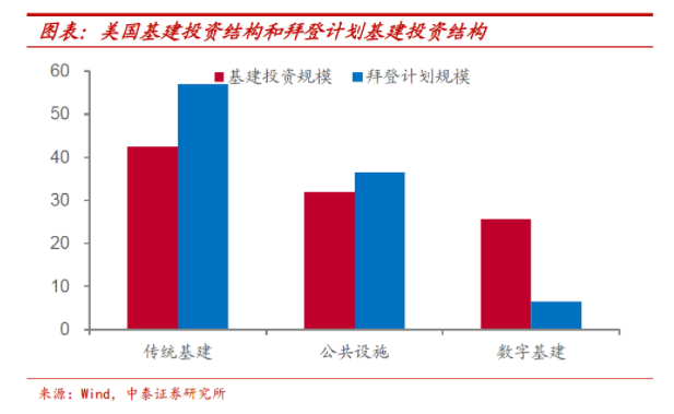 侧重传统基建投资,数字基建投入偏低。而这次拜登的投资计划明显侧重于传统基建和公共设施领域,对数字基建的投入偏低。2017年美国基建投资中传统基建占比略超过42%,而拜登计划中基建投资资金超过57%投向了传统基建领域,高出传统基建占比约15个百分点,在公共设施领域,拜登计划的资金投向也要高出其占比近5个百分点,但在数字基建上,拜登计划投资仅占其基建领域投资的6.5%,明显低于数字基建在基建投资中超过25%的占比。