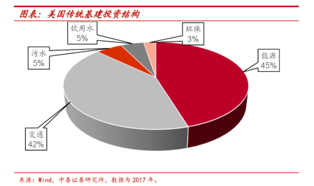 投资计划涵盖较广,基建占据最大比重。事实上,拜登所公布的投资计划涵盖范围较广,虽然其中基础设施建设投资占据了最大比重,但也不乏其他领域的投资,比如针对住房的建造更新投资在该计划中的比例接近10%,再比如对制造业振兴和创新投资的支持也超过计划投资规模的20%,这些领域的投资同样值得关注。按照相对宽泛的统计口径,可以把美国的基础设施投资分为三个部分:一是传统基建如电力、交通和供水等领域的投资;二是公共设施如学校、医院和公共安全领域的投资;三是数字基建如信息技术领域的投资。