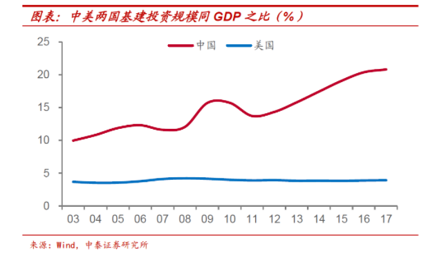 美国基建占比稳定,近年并无较大作为。事实上,这几年来美国在基建投资上确实没有比较大的作为,自2003年起基建投资规模占GDP的比重一直稳定在4%左右,而与之形成鲜明对比的是,我国基建投资规模占GDP的比重从2003年的不足10%,到2017年已经提高到超过20%。