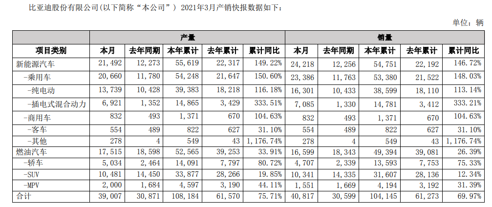 4月6日,比亚迪发布产销快报,3月新能源汽车销量为24218辆,上年同期为12,256辆。1-3月累计为54751辆,同比增长146.72%。