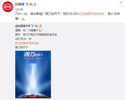 今日,比亚迪官方微博表示,4月7日晚19点30分将召开新车发布会,“用刀片电池开启超级安全元年”。
