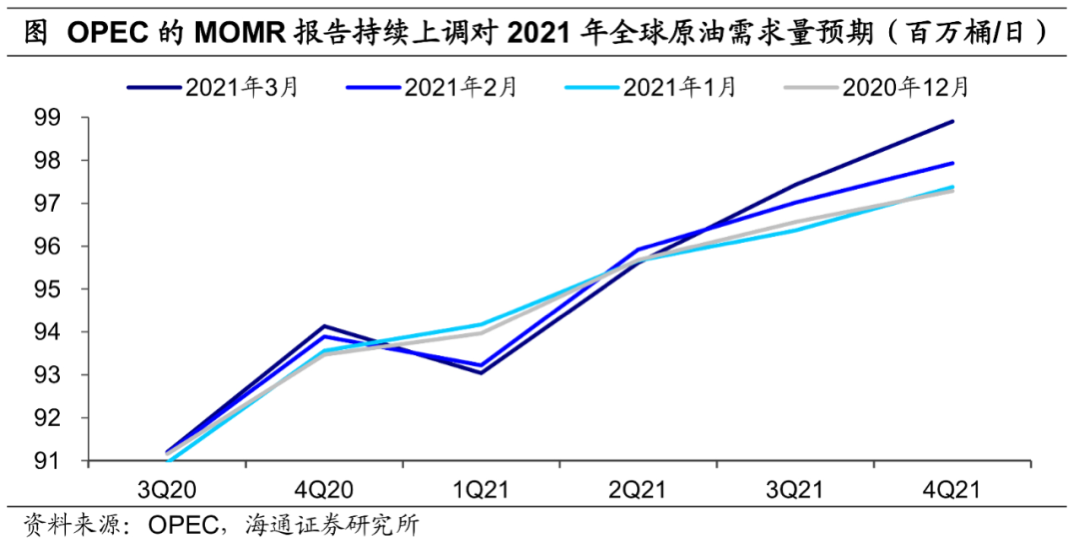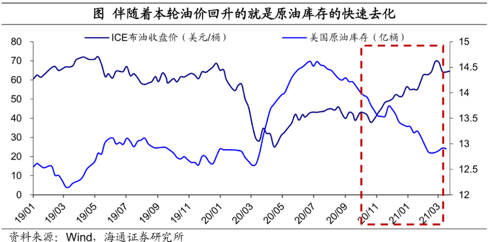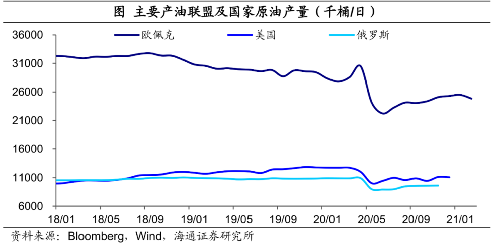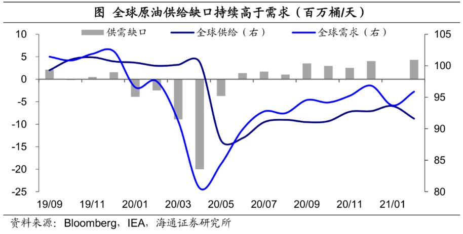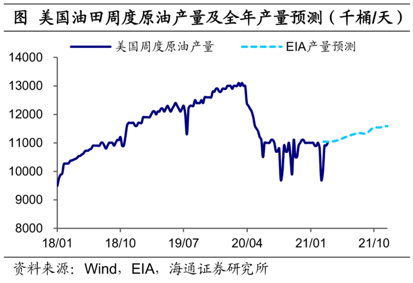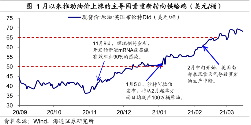 而今年以来,推动油价上涨的主导因素重新转向供给端。1月5日,沙特突然宣布将从2月起单方面日均减产100万桶原油,此后伊拉克也表示将在1月和2月将石油产量削减至360万桶/日。需求修复确定性较高情况下,收缩的供给端重新转为主导因素,带动1月原油涨价约9%。2月开始美国南部严寒天气阻碍页岩油生产,进一步推升供给风险,此后油价站上65美元/桶,回到疫情之前水平。