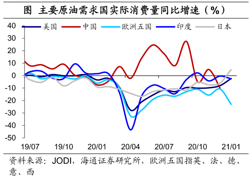从地区看,未来原油整体需求的回升,仍主要依赖于美国和欧洲的复苏。美国和中国为全球前两大原油消费国,占比分别达到20%和14%(2019年),而后是欧洲五国、印度、日本等。由于率先控制住疫情,去年我国原油消费增速远领先于其他经济体,甚至大幅超过疫情之前的水平。相比之下,其他主要需求国的原油消费恢复明显落后,其中欧洲地区的复苏空间大于美国:今年1月,美国原油消费同比增速已回升至-2.3%,欧洲五国同比则大幅回落至-23%。