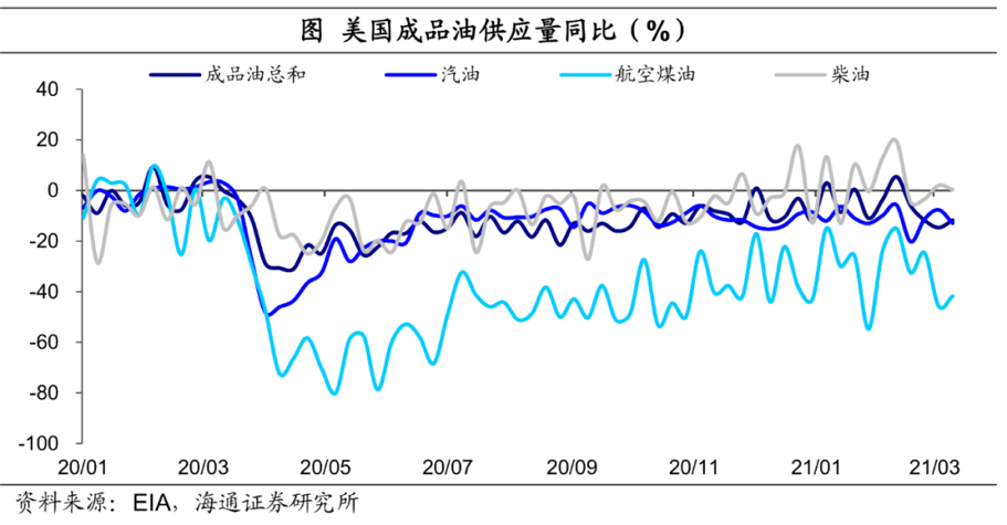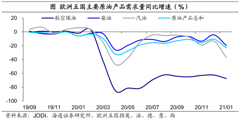成品油消费结构也呈现类似的恢复趋势。在所有成品油类型中,汽油柴油总消费占比接近六成,航空煤油占比近一成。从美国成品油消费看,由于与工业、货运相关度更高,全美柴油消费在今年2月已经基本恢复,而疫情防控隔离措施对居民出行的限制仍在持续,航空煤油和汽油消费表现疲弱,尤其是航空煤油2月供给量同比仍有25%的降幅。相比之下,欧洲主要油品需求的恢复均要落后于美国,当地航空煤油消费量甚至仅恢复到正常时期的四成左右。