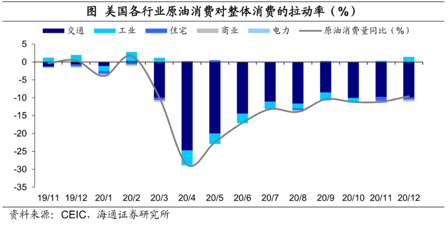 从行业看,工业用油稳步恢复,交通用油需求缺口仍大。以美国为例,2019年全美原油消费约七成用于交通运输行业,工业消费占到24%,剩余的用于发电、商业等。到去年12月,工业原油消费量同比已经转正,但交运用油仅恢复到上年同期的85%,对整体原油消费造成近10个百分点的拖累。