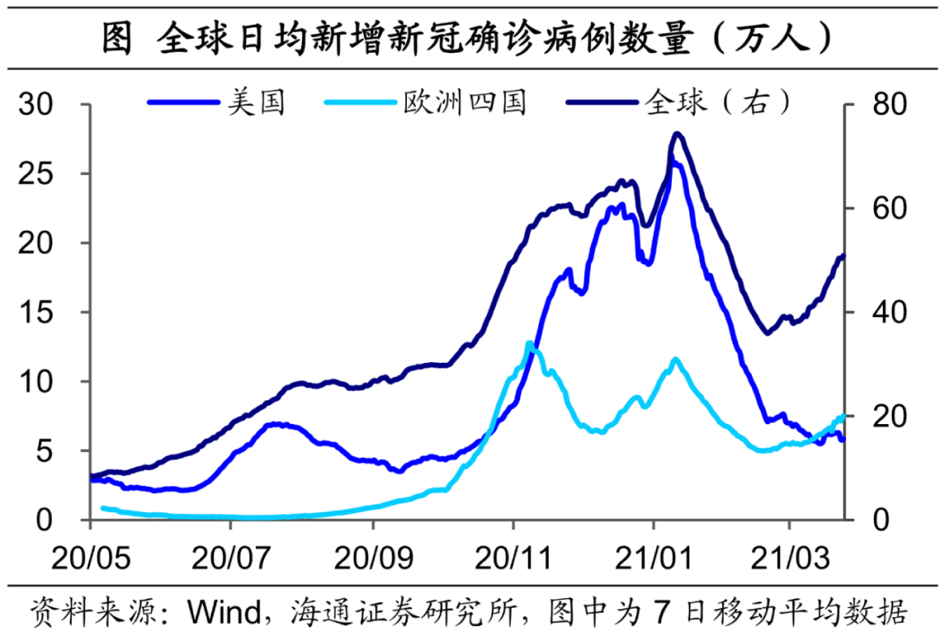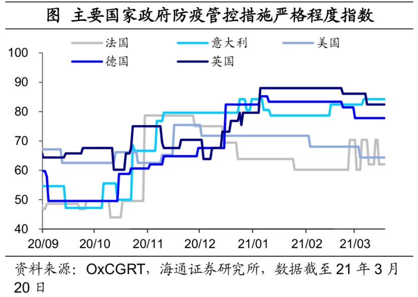 油价经历了前期大涨后,短期有所回调,主要是因为欧洲疫情抬头、封锁措施延长,使得需求恢复预期边际转弱,从而对油价产生扰动。今年1月以来,全球每日新增新冠确诊病例数持续回落,疫苗接种也在逐步铺开,疫情本有向好趋势。但进入3月,欧洲明显受到变异病毒的影响,多国面临第三波新冠疫情,包括法国、意大利、德国等的新增确诊人数加速回升,也因此,法国和德国决定延长“封城”时间,意大利则将罗马等半数以上地区升级为“红色区域”。由于对欧洲需求疲软和美国原油库存上升的担忧,市场短期情绪转弱,原油价格继而震荡下行,截至3月30日,3月内最大回落幅度达到11.6%。
