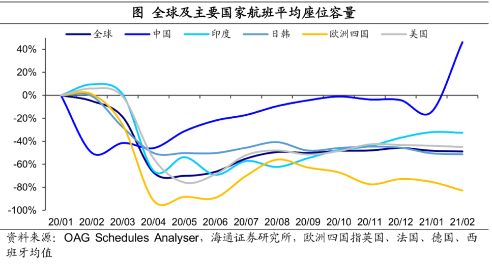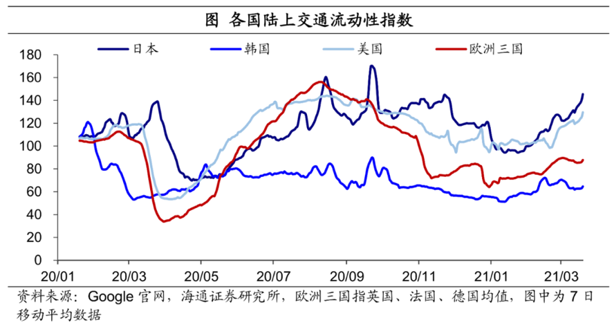 汽油、航空煤油的需求复苏情况,则可以跟踪各地的交通流动性以及航班指标。比如,不管是陆上交通还是航空出行,欧洲的恢复进度都要落后于美国,也对应了两地原油需求回暖的分化。