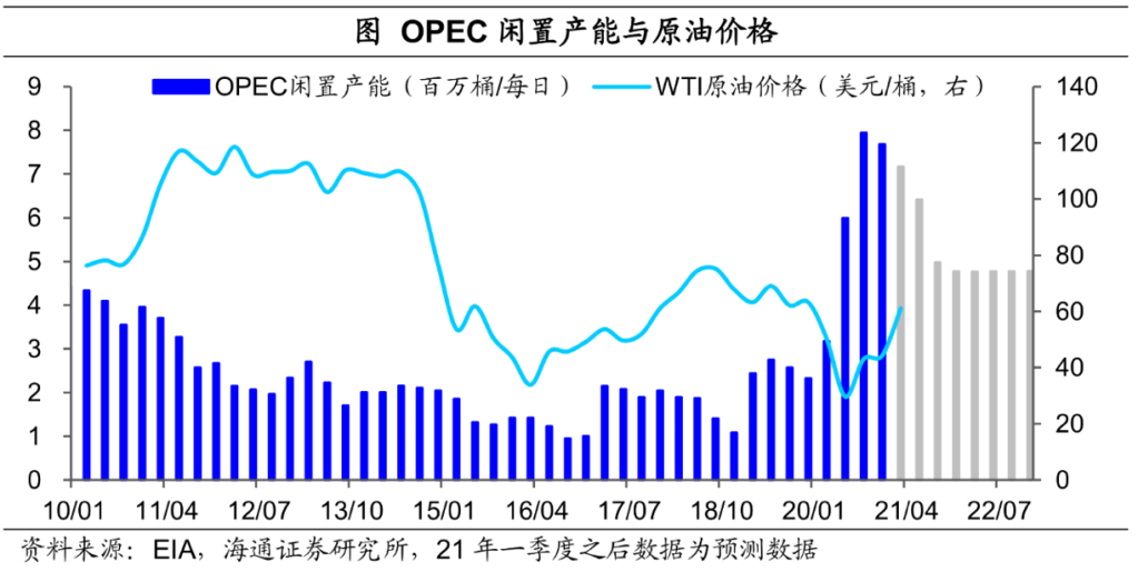 至于本轮高油价能维持多久,则要看供给端跟进的速度。回顾历史,在需求增长作为油价走强的核心动力时,供给能够多快跟进决定了高油价的持续时间。与此前不同的是,当前欧佩克供给收缩对应着较高的闲置产能,这意味着,若意图增产,供给释放的速度将明显更快。随着油价维持高位,预计欧佩克产能或缓慢释放。