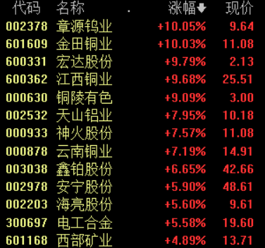 4月8日,有色金属板块午后走强,截至发稿,章源钨业、金田铜业涨停,铜陵有色、天山铝业、神火股份、云南铜业等走高。