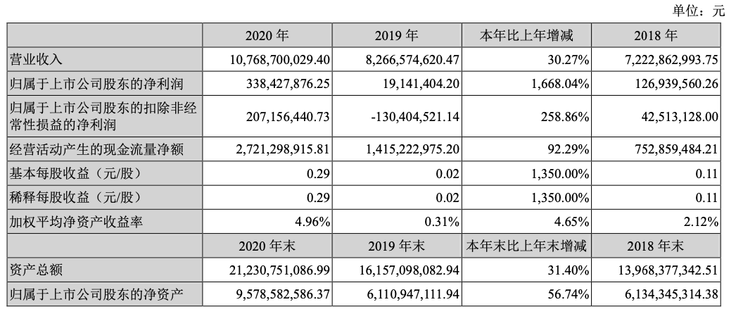 报告显示,2020年通富微电实现营业收入107.69亿元,同比增长30.27%;实现归母净利润3.38亿元,同比增长1668.04%;实现扣非后归母净利润2.07亿元,2019年为-1.30亿元。