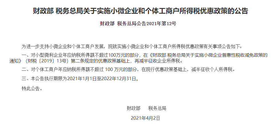 4月9日,财政部、税务总局发布关于实施小微企业和个体工商户所得税优惠政策的公告。公告明确,对个体工商户年应纳税所得额不超过100万元的部分,在现行优惠政策基础上,减半征收个人所得税。