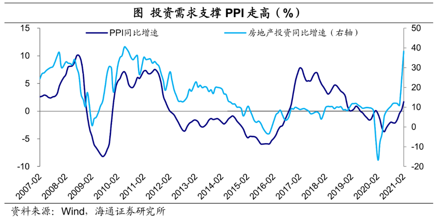 第二,从需求端来看,我国PPI走势和固定资产投资、尤其是房地产投资高度相关。去年在货币信用刺激下,房地产经济大幅反弹,带动了对工业品的需求,支撑价格走高。