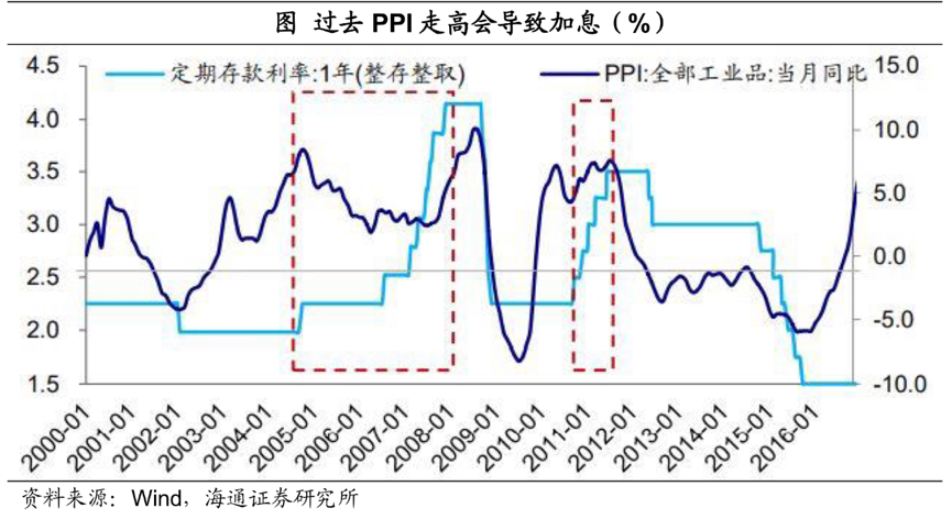 在以往的规律中,PPI的大幅走高都会导致央行的加息。今年4-5月的PPI同比会更高,会不会导致央行的加息风险呢?或者至少导致短端资金利率操作上的偏紧呢?