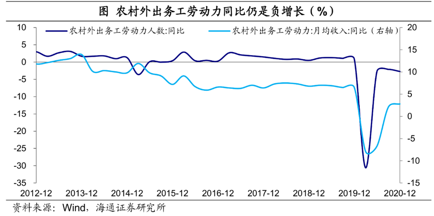 另一方面居民就业和收入也受到压制,影响消费能力。例如截至去年底,农村外出务工劳动力数量同比依然负增长了2.7%,而在之前的连续几年内从来没有出现过负增长,外出务工人员的月均收入也和疫情之前有一定差距。所以即使是非假期时间,居民消费增速也没有回到疫情前的水平,这可能主要受到居民就业和收入的压制。