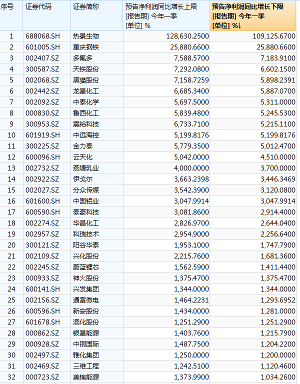 据统计,截至目前,两市共有637家上市公司披露了2021年一季度业绩预告。按预告净利润同比增长下限来看,有32只个股业绩预增10倍以上。
