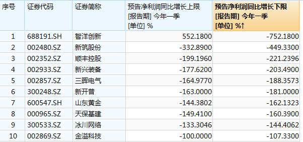 另外,两市共有37只个股业绩预计下滑。其中,智洋创新预计一季度净利同比-752.18%-552.18%。按预告净利润同比增长下限来看,可能录得下降幅度最大。此外,新筑股份、顺丰控股、新兴装备业绩预计同比下降449%、221%、203%。