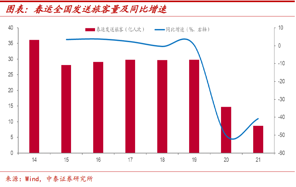 就地过年压抑需求。事实上,服务消费部分的恢复不仅需要居民收入的改善,还依赖于闲暇时间的投入,因此假期常是服务消费需求释放的重要时间窗口。但由于今年春节前后,我国部分地区疫情又现反复,“就地过年”政策使得服务消费需求再度被压抑。2021年我国春运旅客发送量甚至不如2020年同期水平。