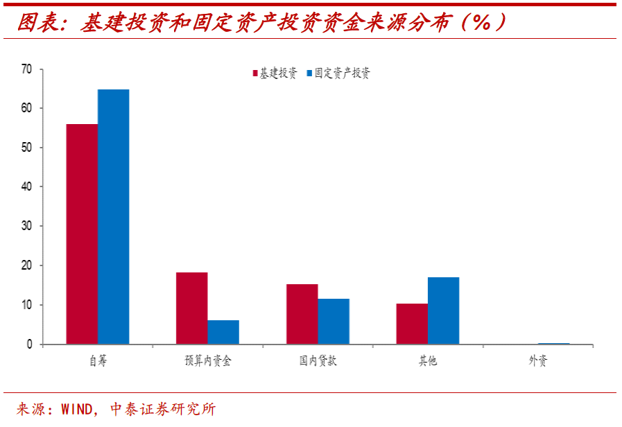 基建依赖政府融资。政府降杠杆过程中基建投资首当其冲。从投资资金的来源上看,基建投资资金中有超过15%来自于财政预算内资金,远高于固定资产投资平均6%左右的比例,而且基建投资资金来源占比最高的自筹部分,很大程度上也是来自于政府性基金、城投平台融资等广义财政资金的支持。政府杠杆率的降低无疑会影响基建融资环境,进而拖累基建投资。
