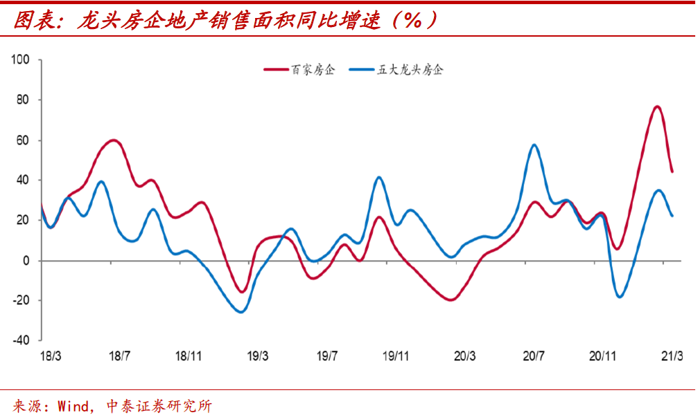 龙头房企销量回落。从龙头房企情况来看,地产销售面积增速已经开始见顶回落。3月五大、百家龙头房企销量增速分别为22.2%和44.3%,虽因去年同期低基数而仍保持较高增长,但较前两月增速已有下滑。