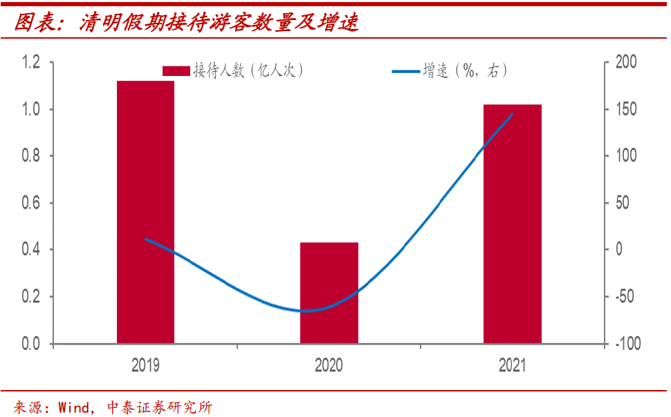 迎来假期时间窗口。而今年二季度假期相对较多,加上国内疫情得到控制,服务消费或将迎来较大程度的改善。刚刚过去的清明假期,全国接待游客人数就反弹至接近疫情前2019年同期的水平,旅游收入也比2020年同期有比较明显的增长。