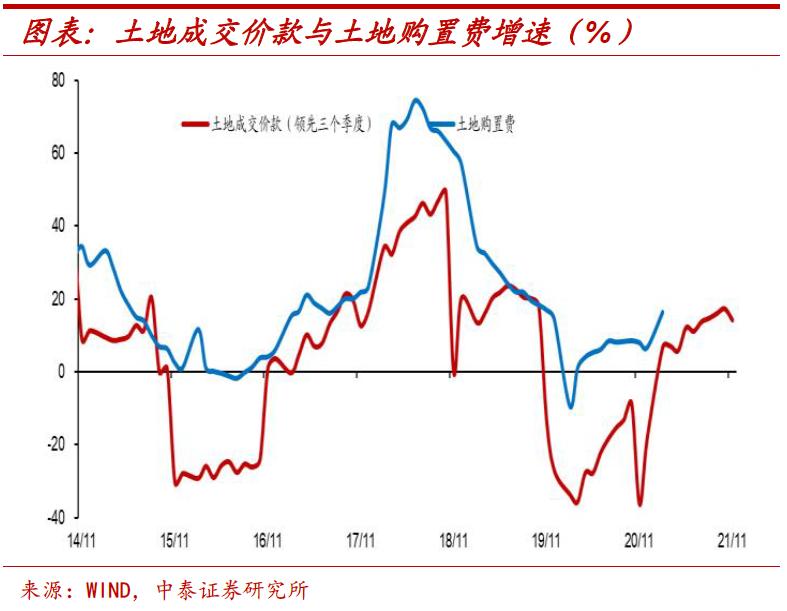 土地费用支撑投资。去年土地成交情况尚可,使得土地成交价款增速持续修复,而这笔费用将在今年的土地购置费中逐渐体现,因此短期来看,费用部分仍将对地产投资增速形成一定的支撑,但这部分并不计入GDP统计之中,地产投资对于经济增长的拉动作用将趋于走弱。