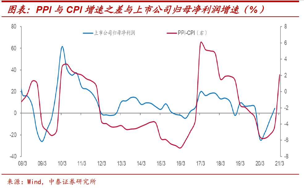 通胀格局利好盈利。CPI增速平稳而PPI增速的加速上行,会使得PPI和CPI增速之差显著扩大,而这一“剪刀差”的扩大事实上利好于上市企业盈利,两者增速走势趋于同步。那么,根据我们的预计,二季度PPI增速有望见顶回落,这意味着上半年A股盈利增速或将持续改善。