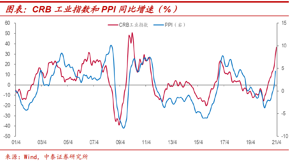 PPI增速继续冲高。3月PPI同比增速突破4%,而4月以来CRB工业指数继续上行,在大宗商品价格上涨的带动下,PPI增速短期仍存在着继续冲高的压力,但我们预计,二季度PPI同比或将加速见顶。