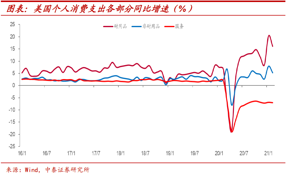 商品需求保障出口。以美国为例,在经济还未完全放开的情况下,服务消费部分增速仍较低迷,加之1.9万亿美元财政刺激资金下达,这部分资金继续溢出到商品消费,特别是使得耐用品消费支出保持了较高增速,这其实保障了其对于贸易品的需求。