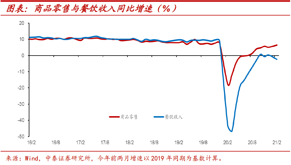 服务消费恢复缓慢。从国内消费情况来看,疫情后服务消费部分恢复进度缓慢。以社零数据为例,其中的商品零售增速自2020年下半年以来就已由负转正,而餐饮收入部分增速在去年12月底才刚刚转正,2020年全年增速跌幅仍超过16%。