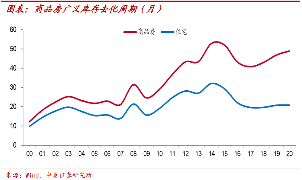 今年前两月数据受到疫情导致的基数干扰,事实上当前待售面积相比于2019年前两月仍增长0.3%;另一方面,若以历年累计新开工面积与历年累计销售面积之差所构建的广义库存指标来看,2020年底无论是商品房还是住宅的广义库存去化周期较2019年底均有所上升。