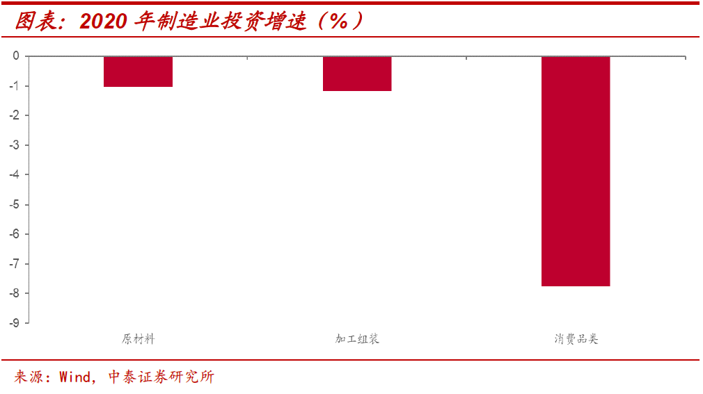 制造业投资回升有望。回望2020年制造业投资情况,原材料类和加工组装类行业投资基本上恢复到和疫情前相当的水平,而下游消费品类行业是主要拖累,去年增速跌幅超过7%,这部分投资和消费的表现密切相关。在出口链补库存和消费恢复的带动下,制造业投资增速有望迎来持续回升。