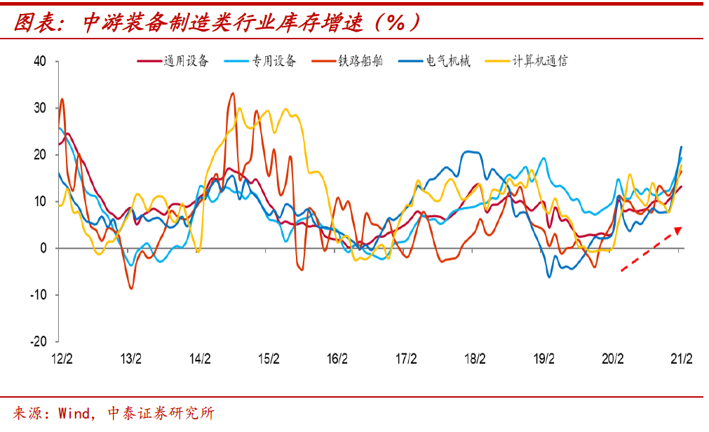 补库动力来自外需。事实上,这一轮补库存的动力主要来自于外需。从中观行业来看,出口依赖度较高的中游装备制造类行业多数处于补库阶段,如通用设备、专用设备、计算机通信、铁路船舶和电气机械行业产成品存货增速在2020年四季度以来均呈震荡上行。